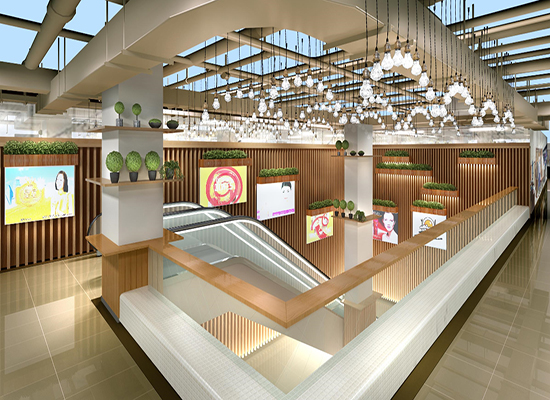 共享中庭:B1B2層的人流交匯處,滿足人文需求考慮,我們采用多點(diǎn)光源的形式增加整個(gè)區(qū)域的照明亮度。墻面的廣告牌及綠色盆栽設(shè)置同時(shí)滿足綠色理念和品牌宣傳的需求。逛街的你可以很方便的在這里歇腳閱讀、網(wǎng)上沖浪的地方。